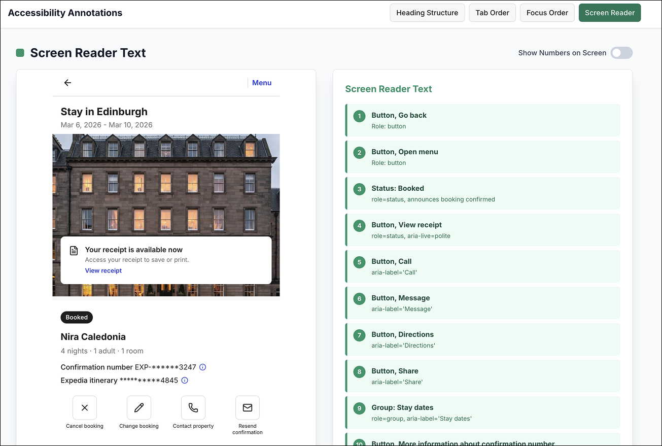 I began by prompting the agent to generate explicit accessibility annotations for the Family Traveler module (from Experiment #3), including: