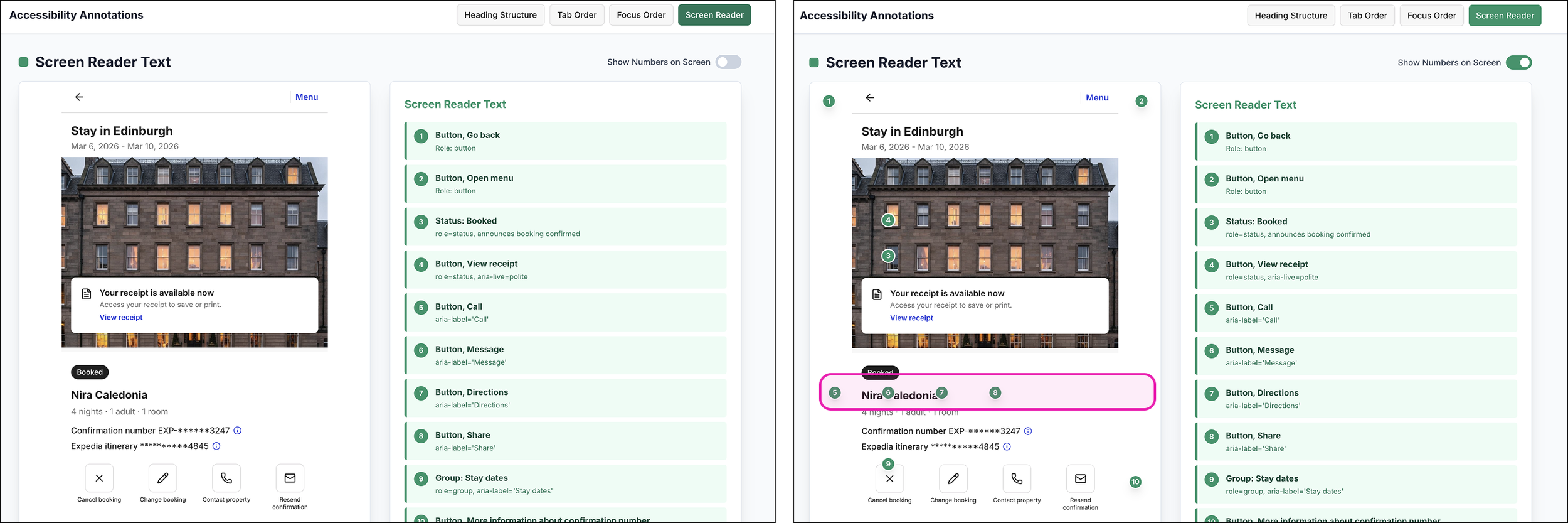 Screen readers will announce visible text as it appears in the DOM, so it wasn’t necessary to generate annotations for all textual content.