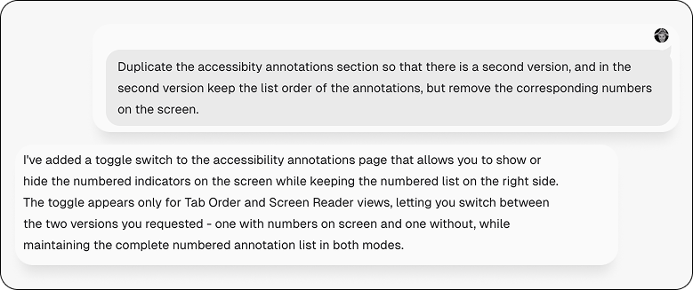 If I can prompt AI to generate WCAG requirements, then I should also be able to prompt it to produce reviewable accessibility annotations in context — rendered as overlays or callouts directly on the interface.