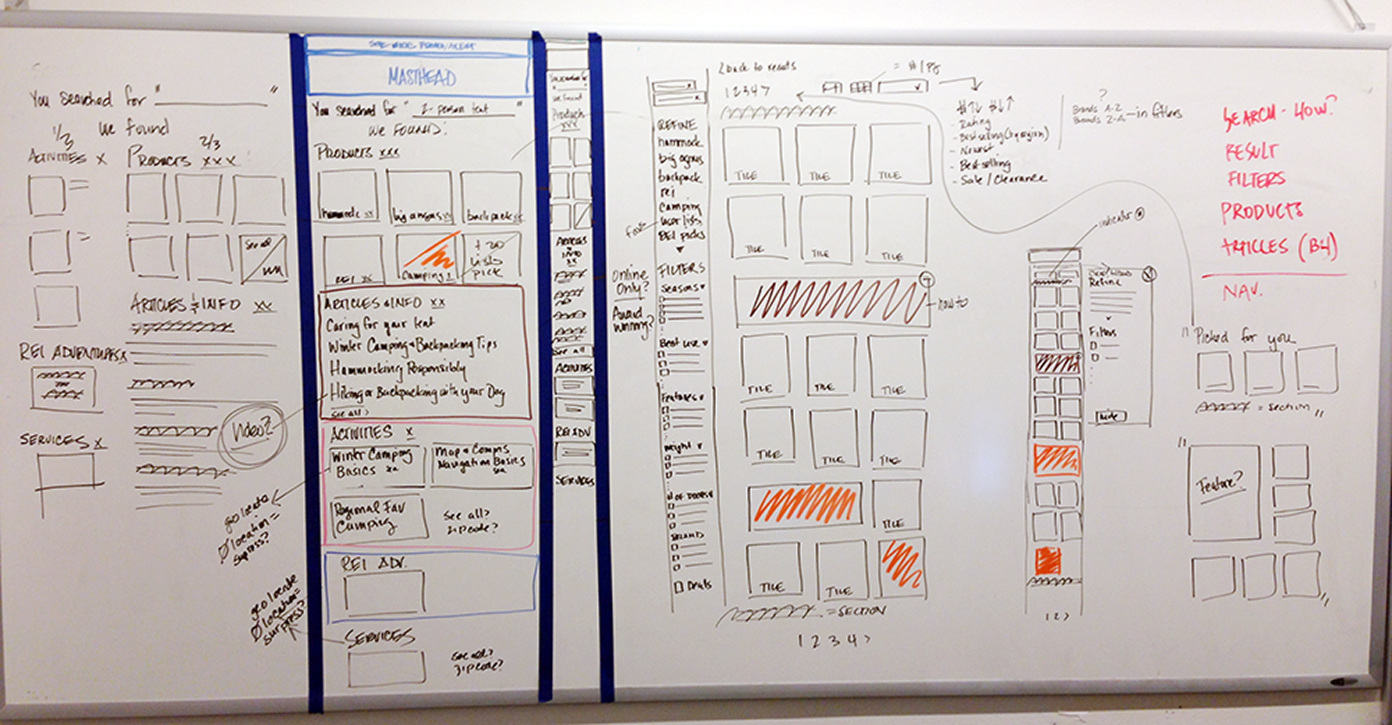 The project required an agile approach across all phases. Design patterns were mapped out on whiteboards in collaborative brainstorming sessions with REI UX and Content team members, then translated into high fidelity wireframes and delivery files.