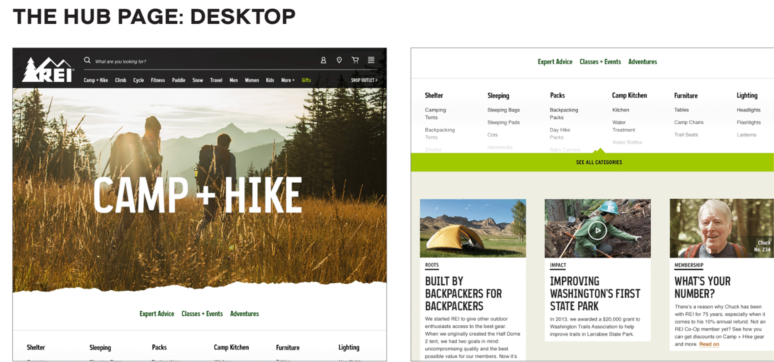 The current REI experience retains much of the information architecture, content strategy, and UX/UI recommendations and designs created by myself and the team.