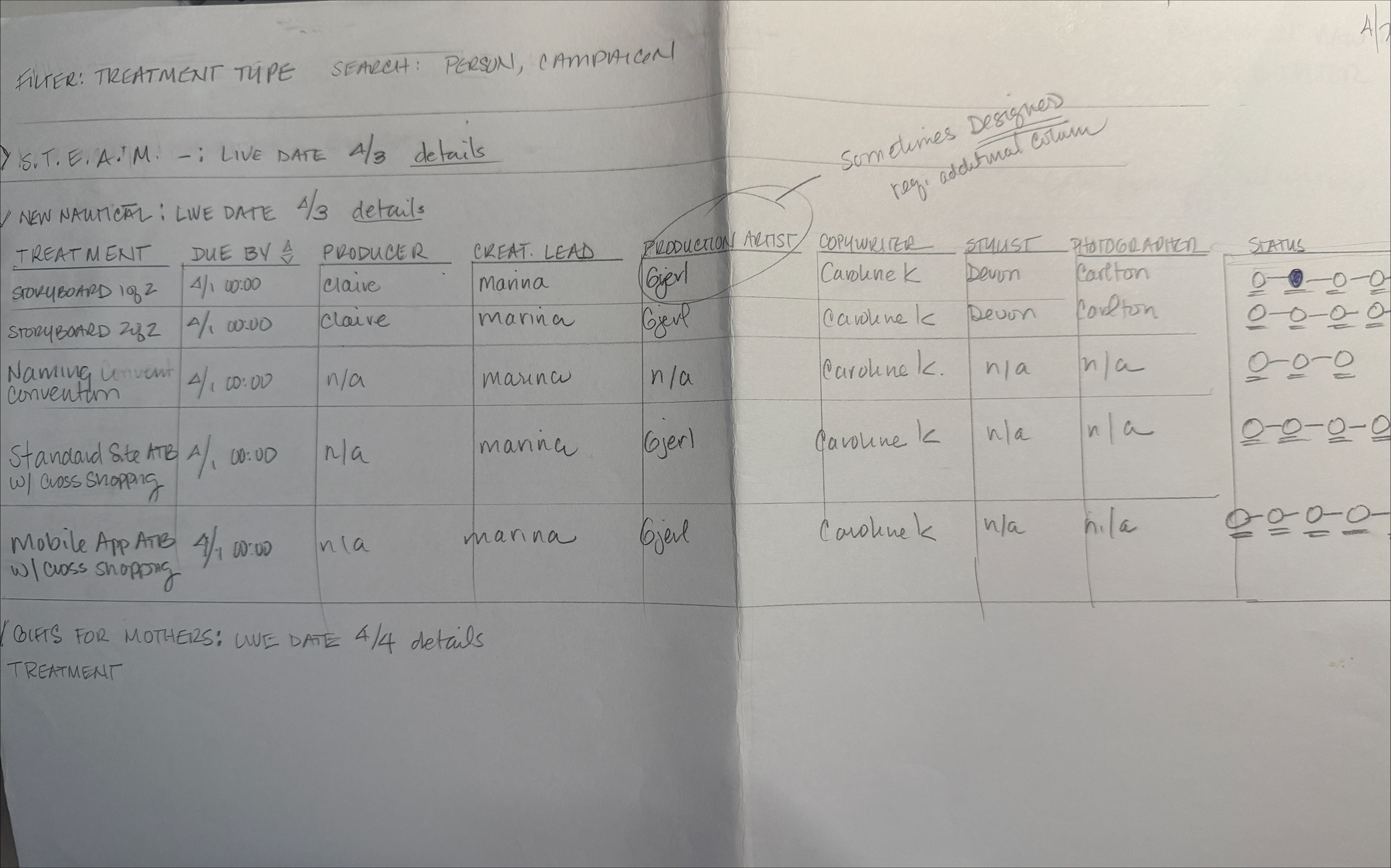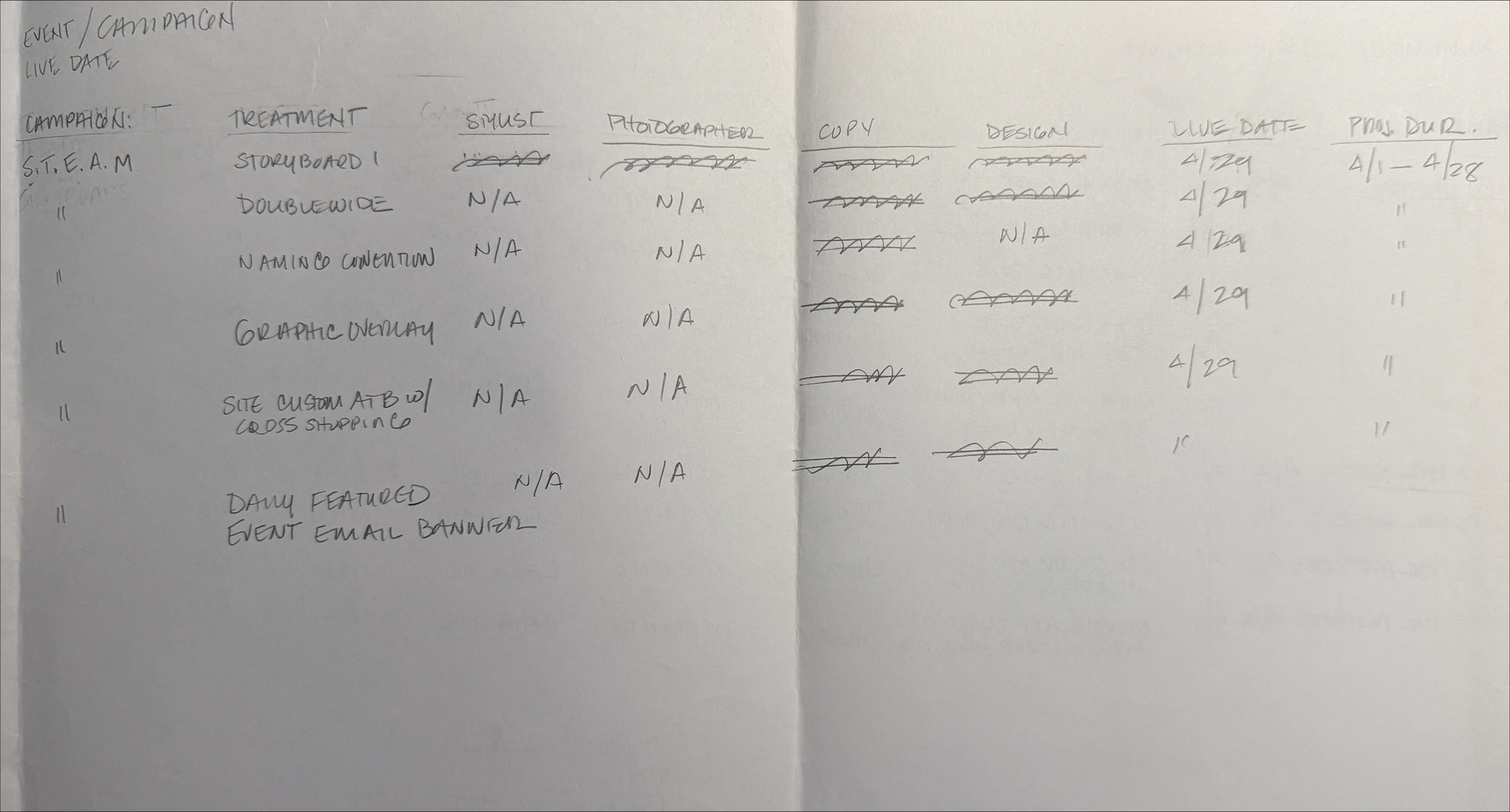 Initial drafts were created at the white board and the transferred to InDesign for easier communication and alignment.