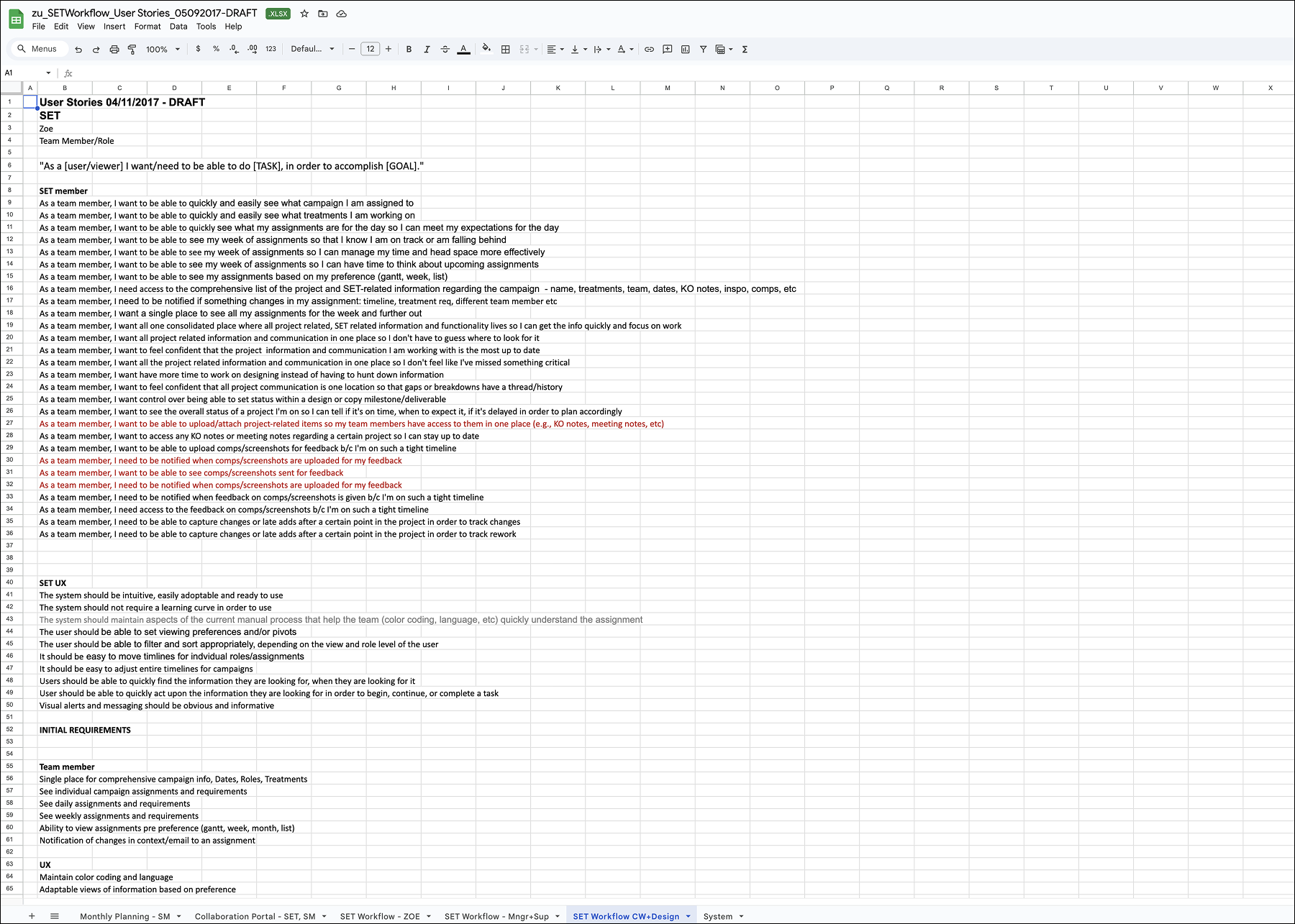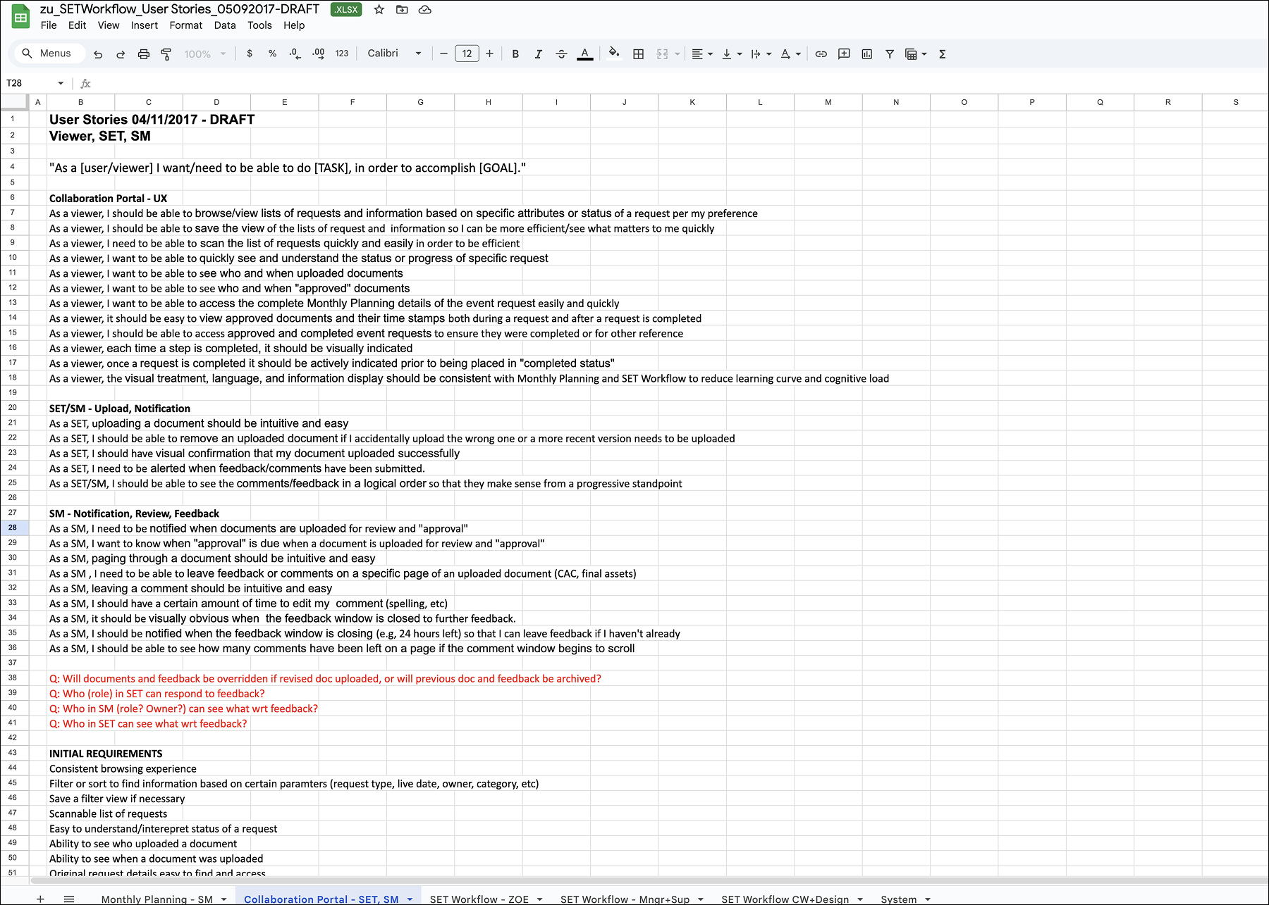 The stories captured end-to-end requirements across monthly planning, event creation, review, modification, notifications, and status tracking. Particular focus was placed on workflow continuity (start, pause, resume), visibility of status and thresholds, calendar-based planning, role-based permissions, and the ability to differentiate between events with and without SET involvement.