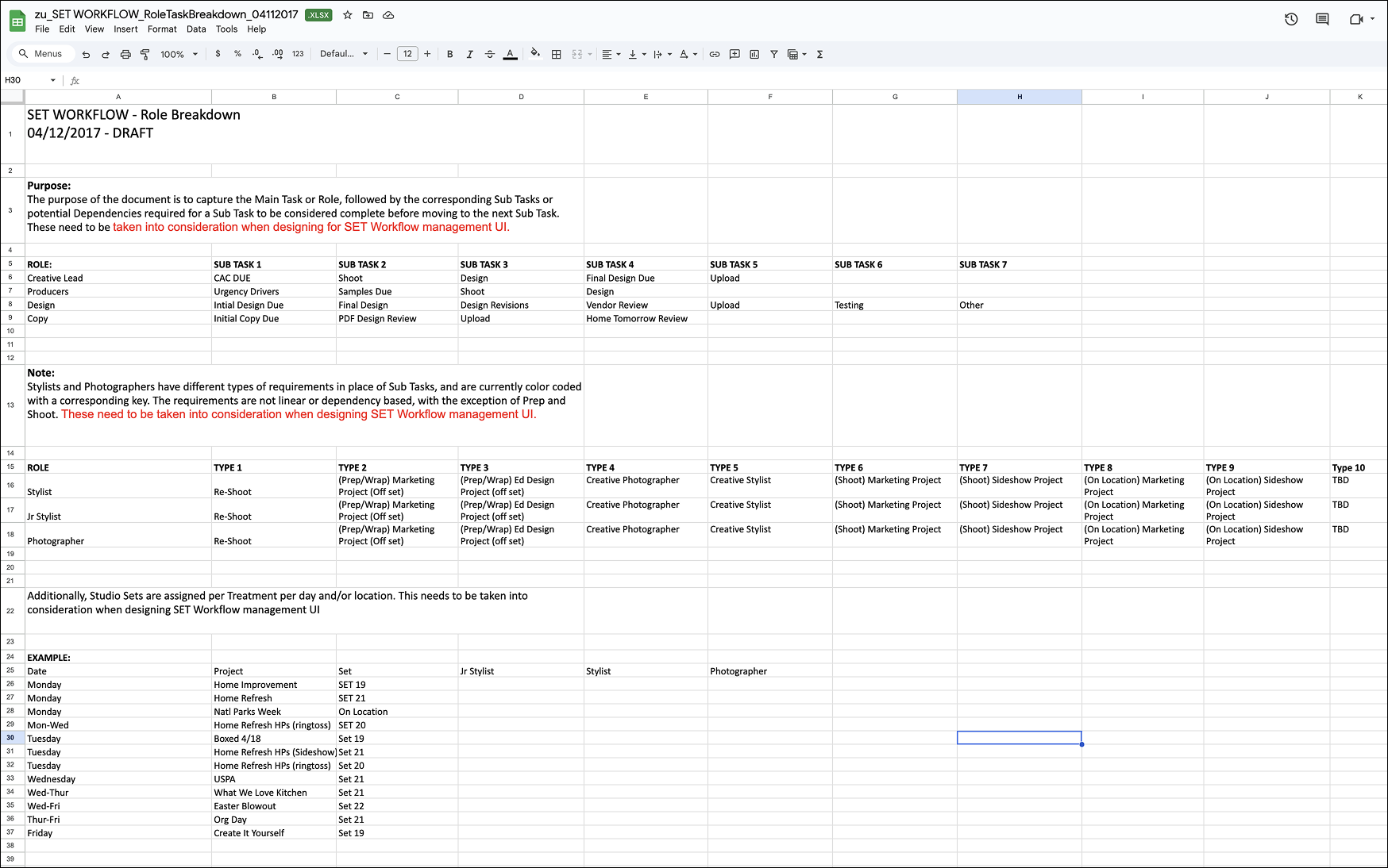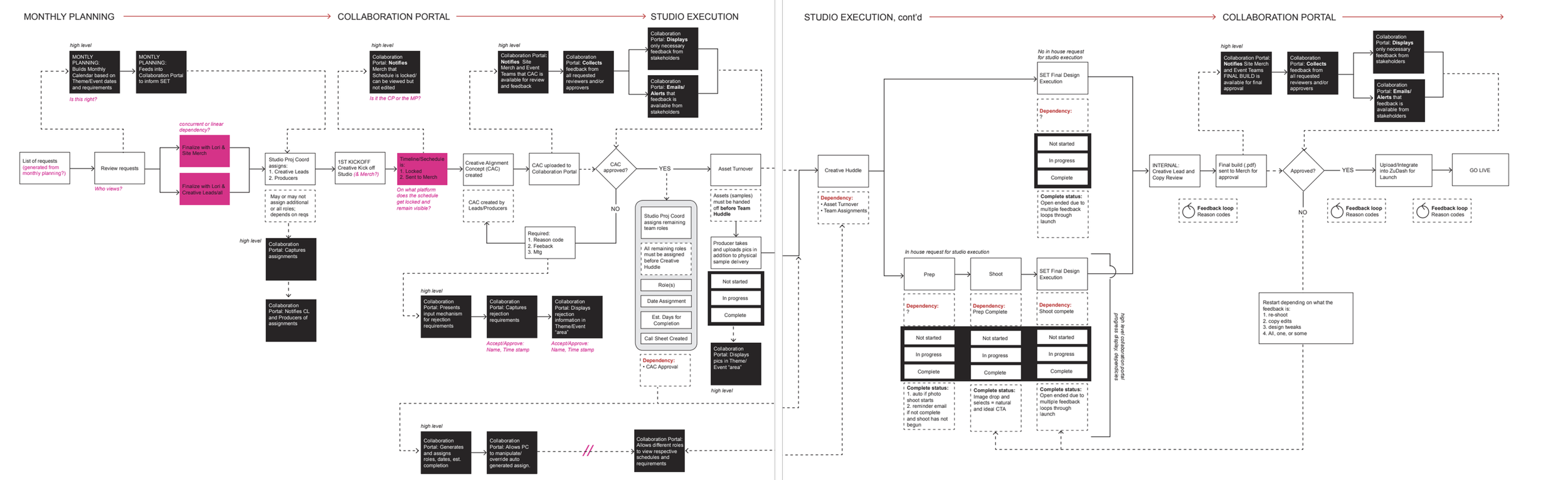 These flows outlined state changes, decision points, role-based permissions, submission gates, overrides, notifications, and dependencies between systems (e.g., Collaboration Portal, SET workflow, Merch Calendar).