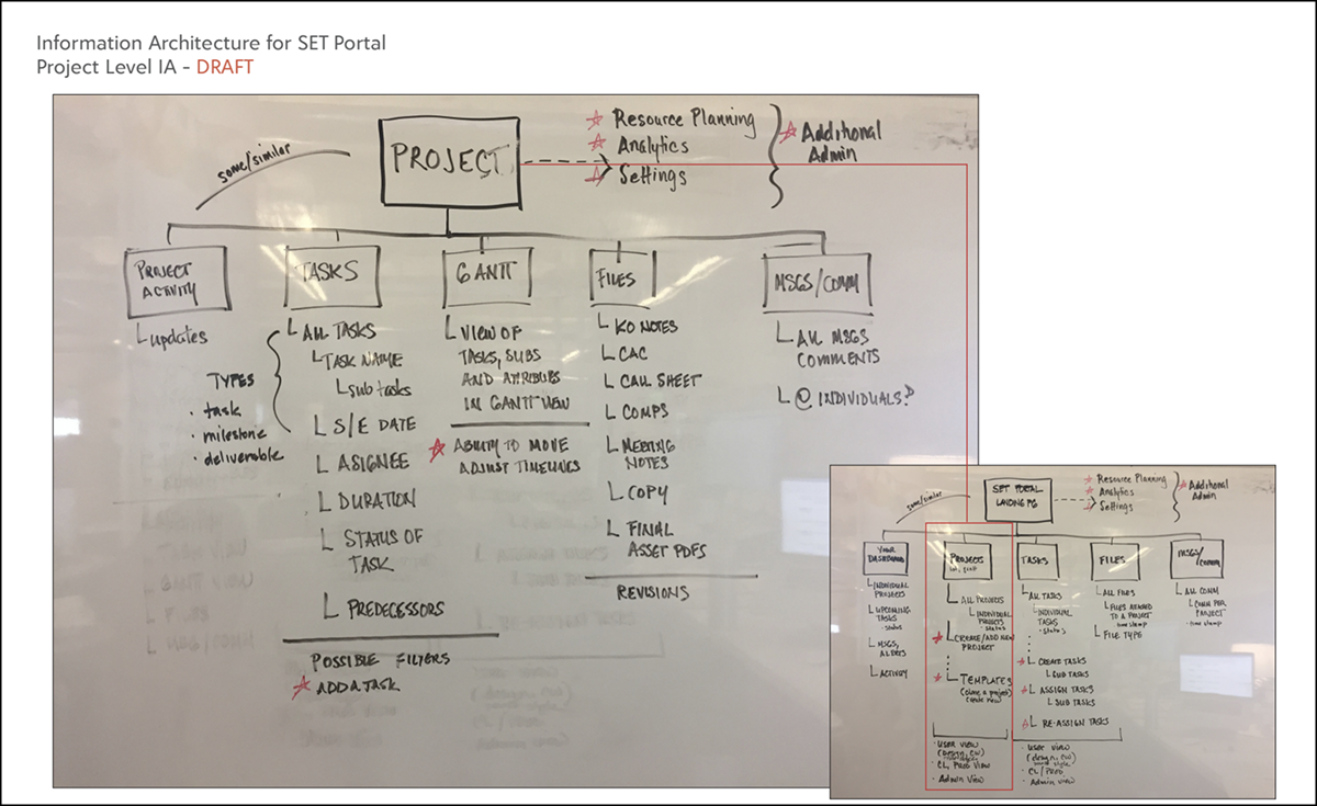 The information architecture adopted a project-centric governance model, positioning the Project Dashboard as the primary system anchor. Functional domains—Task Management, Resource Planning (Gantt), File Management, Communications, and Activity Tracking—were defined as structured categories, with standardized subcomponents to support lifecycle management, auditability, and role-based access.